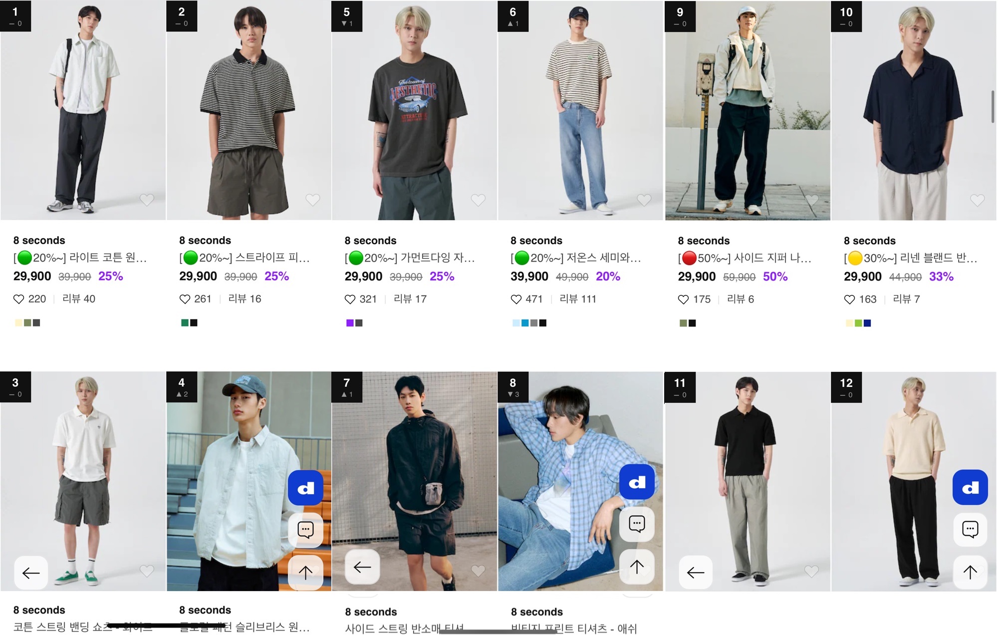 남성 제품 중에서도 전반적으로 깔끔한 셔츠형 기본템들이 상위랭킹에 되어 있는 점을 볼수 있습니다.