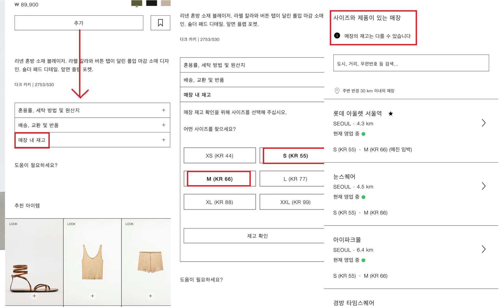 이러한 자라 매장 내에서 제품이 돌고도는 구조를 이용하여 '매장 내 재고' 확인 기능을 활용하여 내가 원하는 제품을 구매하는 것입니다.